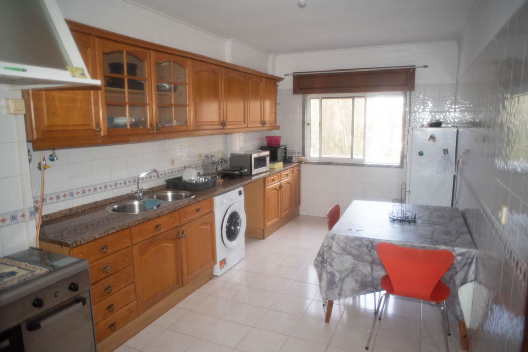 Cozinha equipada, com zona de refeições e bastante arrumação